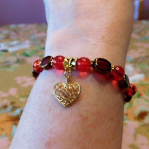 Handmade Red Stretch Bracelet W/Gold Heart Charm - 7.5"