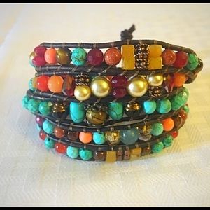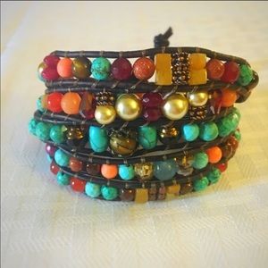 The Renaissance Wrap is my personal favorite! It’s full of color, warmth, vibrance and all of the flash that made the Renaissance Era! Fanciful colors of red, burnt orange, Amber, blues, Browns, peach and copper come alive in the many gemstones I’ve created this bracelet with including turquoise, butterscotch amber, carnelian, aquamarine, bamboo coral, tiger eye and crystals among others! This was made with a double closure to accommodate most wrist sizes😍😮🥰