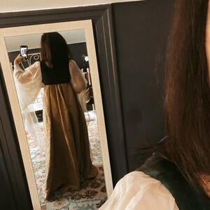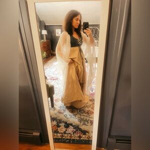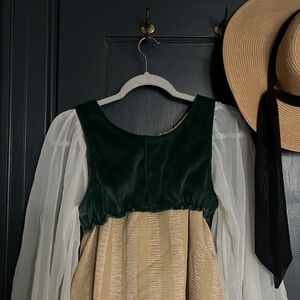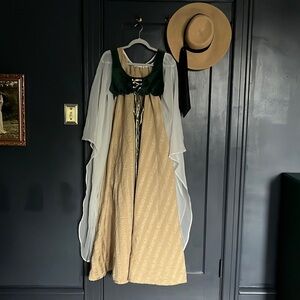 Handmade Renaissance gown- this was handmade by me for an event and I’m ready to pass it on. It’s made with quality fabrics and perfect for cosplay or a trip to the Renaissance Fair! 55 inches in length and 14 inches armpit to armpit but there is elastic in the in the bodice it will also stretch a few more inches. For reference I am generally a size small or extra small and it fits me with room to spare. 🧚♀️👸