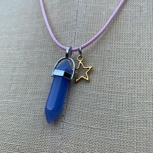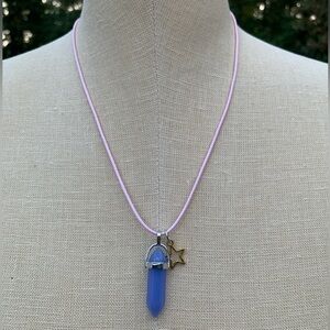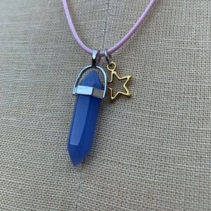 Periwinkle Blue resin crystal-like tower amulet charm with brass colored star cut-out charm on a ballet 🩰 slipper pink colored wax-coated cord necklace.