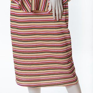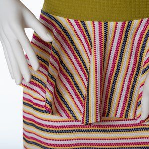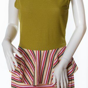 This listing is for a unique handmade form fitted dress. The dress top is made from a very soft chartreuse fabric with an attached skirt in stripped fabric of white, hot pink, yellow and purple.