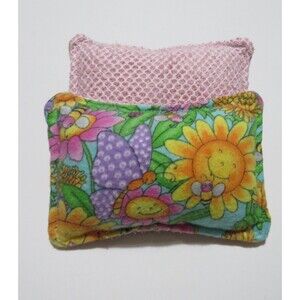 Flower face flannel fabric reusable and washable sponges with white fabric utility mesh and pink terry cloth on the back, set of 2.