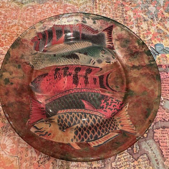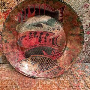 This is an original, handcrafted piece made by me, Kathi of Kathi’s Art Part Deux. It features a vibrant stack of colorful fish from a vintage postcard reproduction, applied using reverse decoupage on an 8" round glass plate. I created a richly blotted background in reds, greens, and golds, then added gold metal leaf to the edges and sealed it with a prism varnish for a subtle shimmer.