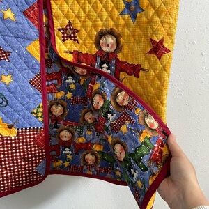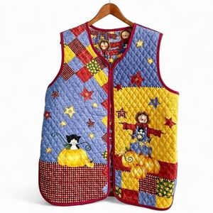 Vibrant quilted vest with patchwork design. Features playful patterns in blue, yellow, and red. Adorable autumn Halloween scarecrow and pumpkin patch quilt vest