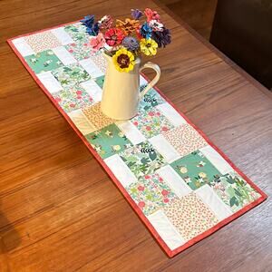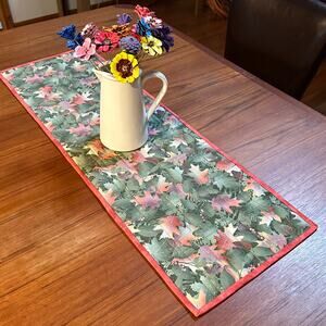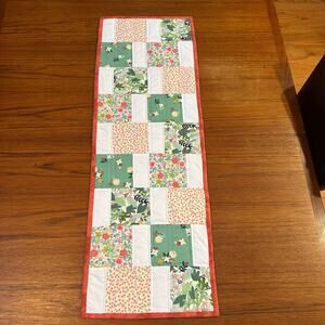 This is a handmade reversible table topper. One side is made from color coordinated green and coral colored florals, and the other is a fall floral design - both of 100% cotton quilting fabric. It is machine quilted and hand quilted around the border. Measures 13.5" by 40".