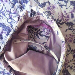 This quilt offers a versatile design with a reversible side, showcasing purple and floral patterns. It includes a matching carrying case for convenient storage. Multiple pockets on packable carrying case.