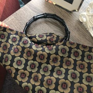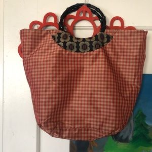 Versatile and charming reversible tote bag with round black plastic handles. One side of fabric is black with red and gold floral design, the other is shimmery red and gold/tan plaid print. Purse was handmade so no branding, made of high quality fabrics. Never used and like brand new.