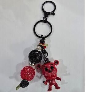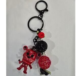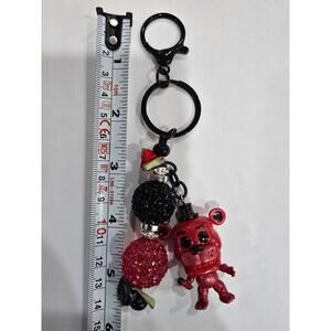 Handmade beaded keychain featuring a reworked mini vinyl bear figure with black, red, and rhinestone bead accents and black-tone hardware. Fun, unique accessory that can be used as a keychain or bag charm.