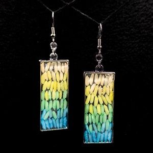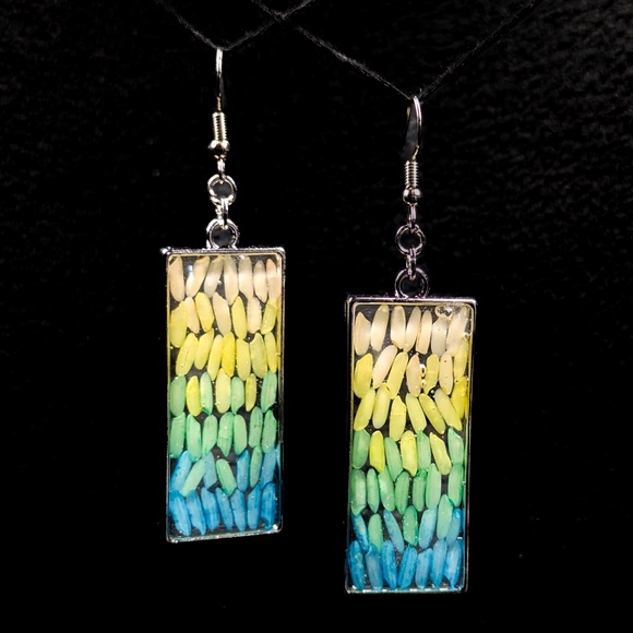 Truly unique handmade earrings made with actual grains of rice set in resin inside a silver metal bezel. Finished with hypoallergenic silver fish hooks and included silicone backers. This pair comes in hues of cream, yellow, turquoise and blue with a cool water lily vibe.