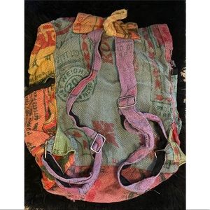 Handmade backpack made from recycled rice sacks. Bought from a vendor at a festival in 2009. Naturally distressed because of the kind of textiles used. The two side pockets are missing the closures. No tears and the inside is clean and tear free as well. A fun bag with lots of space. Light weight and good for traveling.