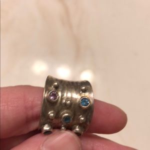 Gorgeous gemstone and silver ring! This is a designer piece I picked up a while back. Couldn’t tell you who it was, but it was pricey. It is handmade and contains amethyst and blue topaz stones. When polished it is a total conversation piece. The necklace pendant I have listed goes with it as a set. I lost the chain but you can use anything.
