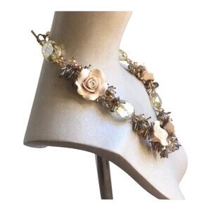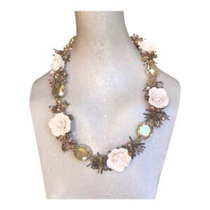 Handmade Romantic Reflective Large Oval Beads Ivory Roses Statement Necklace
