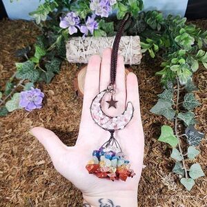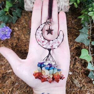 This piece measures 8.25" long and is hand-crafted with rose quartz. From the bottom dangles chips of red jasper, orange aventurine, citrine, turquoise howlite, amethyst and clear quartz. It has a woven loop at the top, making it perfect to hang on your wall, in your car, or even to wear on a necklace cord!