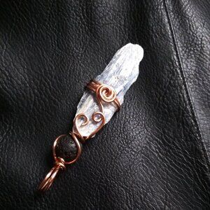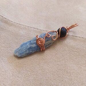 Handmade 4 You! I topped the Kyanite with a black Lava Rock Bead and wire wrapped both with genuine copper jewelry wire in a feminine, minimalist swirl design. Photos show the same pendant on various backgrounds and angles. The good sized bail can handle most medium thickness chains or leather cords.