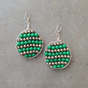 Handmade earrings consisting of round green plastic beads, round silver plastic beads, and silver metal wire. Approximately 1.5" x 1.5". Twine and Stones jewelry is made from repurposed materials and may have unique patina. Earrings do not come with tags but they are a handmade boutique item made by me and have never been worn. No trades. No modeling. Make a reasonable offer. Thanks!
