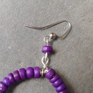 Handmade earrings made from repurposed materials including purple wooden and plastic beads, silver metal wire, and silver metal fish hook style earrings. Twine and Stones jewelry is made from repurposed materials and may have unique patina. This pair of earrings does not come with tags but is a new, handmade boutique item by me and has never been worn. Circle is ~1.5" diameter. No trades. No modeling. Make a reasonable offer. Thanks!