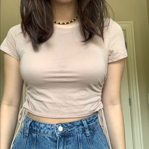 up cycled blush ruched/cinched drawstring t shirt—handmade by me! size small and the sides are adjustable and self tied. not urban outfitters but tagged for exposure! fits like a x small/small