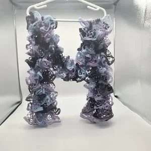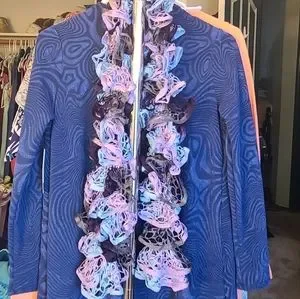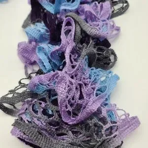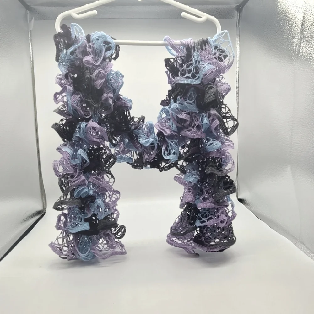This is a beautiful handmade Ruffle Scarf that has gray, blue, purple, and deep purple in it. It would go great with a pair of jeans, maybe a jean jacket. It is 65 inches in length.
