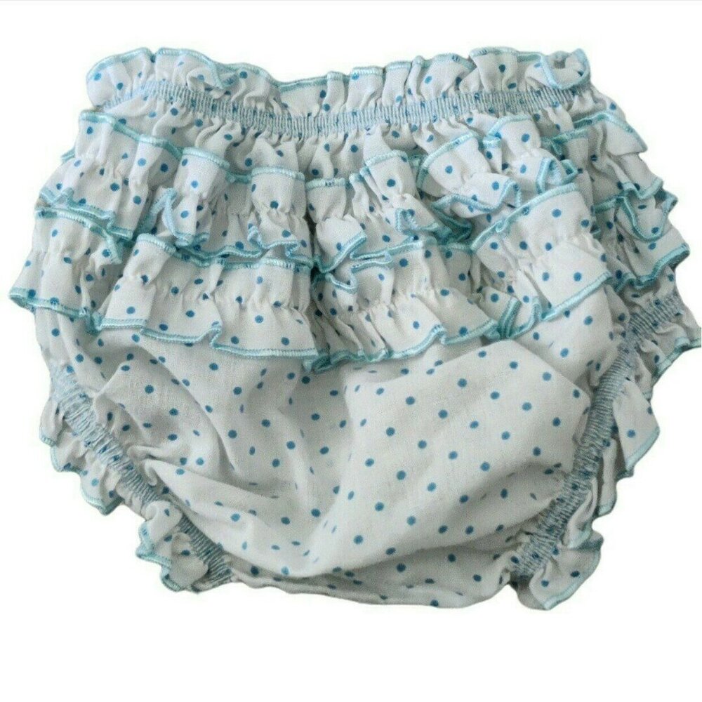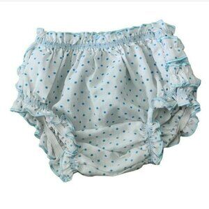 #Handmade #ruffled #bloomers in lovely lightweight #cotton. #White with #blue #polkadots. Soft elastic. These have no size tag but I think I bought them for around the 3/6 month mark. Never washed or worn by us.
