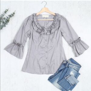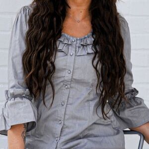 Handmade Ruffled Blouse. Button up with ruflles along neckline and sleeves. Impeccably made by hand with high quality fabrics. These are not your typical boutique quality. Approximate measurements for size L pit to pit is 20” and length is 25” to 26”.
