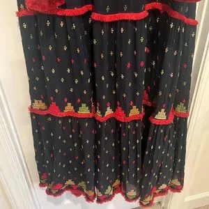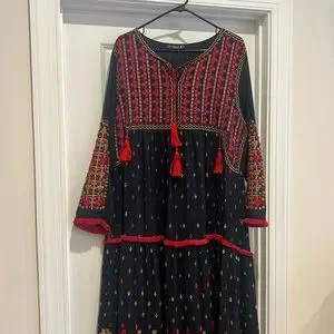 Beautiful handmade dress that has all embroidery work from front to back and made in Morocco. Full length maxi, there’s no belt on this dress. Feel free to ask questions for any additional measurements or details. This dress also has a lining and is an aline gown that fits a XL-XXL. The texture on the dress seems like it has some wear but that’s the nature of it. Not affiliated with any brand. Purchased in a boutique in Dubai.