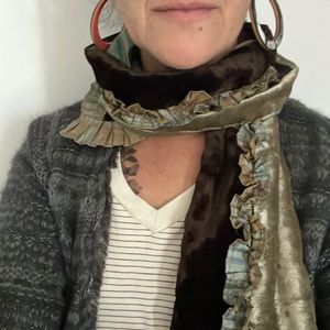 Beautiful handmade scarf with a mix of fabrics, velvet and satin, iridescent ruffle running the length of the scarf and fringing the ends, soft and luxurious.
