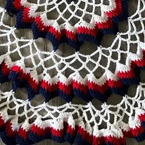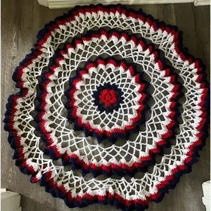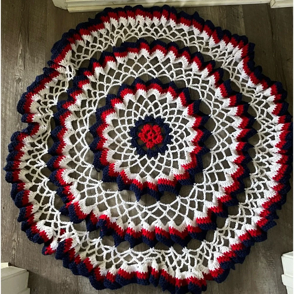Round red white and blue handmade crochet table cover