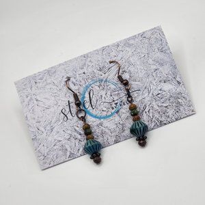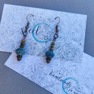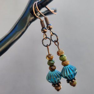 Handmade Drop Earrings with glass bi-cone bead. These unique earrings highlight the sky blue, teal and emerald bead with a bronze finish. Seen with copper ear hooks, also available with stainless steel hooks.