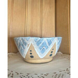 Handmade Rustic Primitive Studio Pottery Ceramic Bowl Blue White Geometric Desig