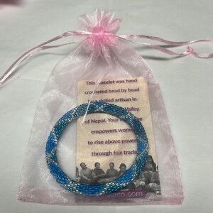 Sashka Bracelets are made with the worlds finest glass and sterling silver beads . They are handmade by skilled Artisan in Kathmandu Napel . Bead by bead they are crocheted. They roll over your hand and retract to your wrist.