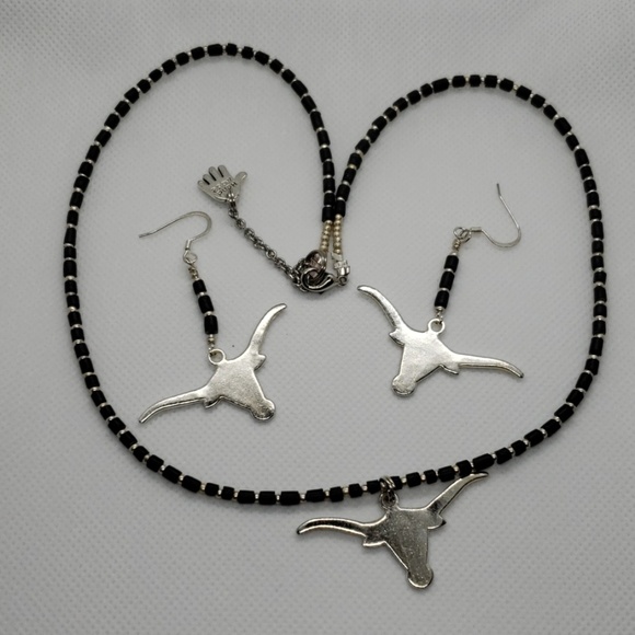 Handmade Longhorn silver necklace and earring set. Black and silver. NWOT
