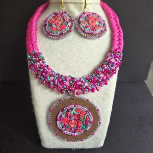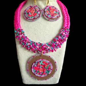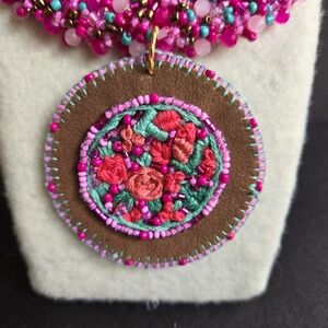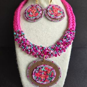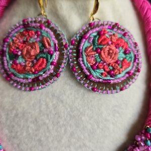 Hand embroidered necklace and earrings using the rococo technique on suede fabric. unique design, new item.