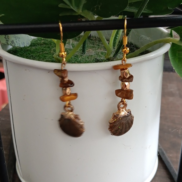 Real tiger eye chips in this shell theme earrings.