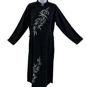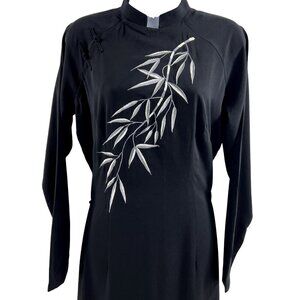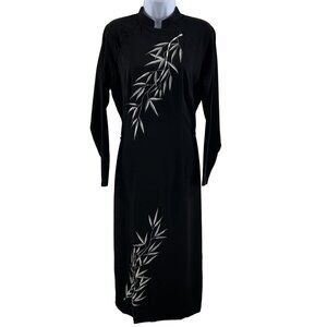 Handmade 100% Silk Maxi Dress S-M Cheongsam Black Mandarin Collar Long Sleeve Bamboo Leaf Embroidered