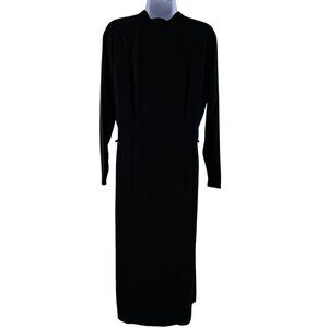 A fabulous black silk dress from Ted Lapidus. It has long sleeves, a stand up collar and light shoulder padding. There is a beautiful design in silver and white sequins outlined in dark silver glass tubular beads radiating from one shoulder- stunning. It is fully lined in black silk, has back and cuff zippers and a small slit at the back center hem.