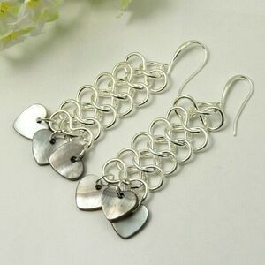 Handmade Silver Chainmail Dangle Earrings Hearts Mother of Pearl Shell