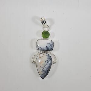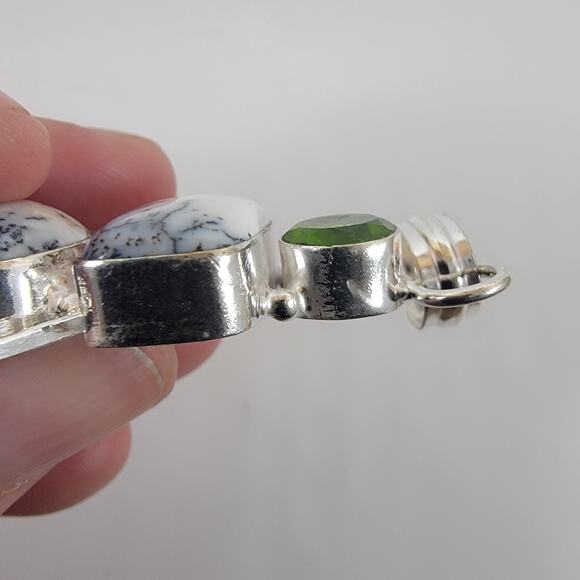 Discover the enchanting allure of this handcrafted sterling silver pendant! It showcases two captivating dendritic opals, celebrated for their unique natural black branch-like inclusions set against a pristine, snowy white backdrop. A faceted green peridot gemstone introduces a refreshing splash of color, enhancing the pendant's overall charm. The exquisitely detailed silverwork perfectly accentuates the organic beauty of these remarkable stones. As a special bonus, the pendant includes a complimentary 20-inch sterling silver snake chain, making it ready to wear or gift. Elevate your jewelry collection with this one-of-a-kind piece that blends natural artistry with elegant design!