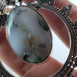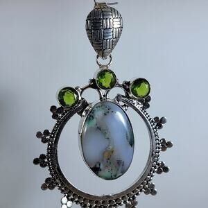 This exquisite handmade sterling silver pendant features a captivating dendritic opal, celebrated for its unique tree-like inclusions. The opal is gracefully set within an intricately designed circular frame, enhanced by three vibrant green peridot gemstones that add a pop of color and elegance.