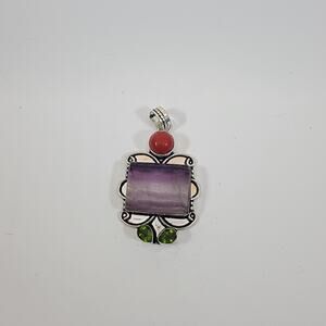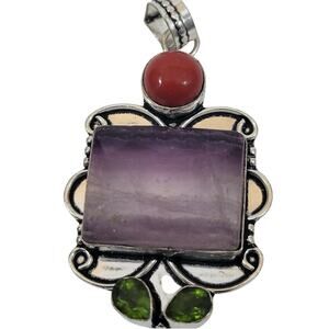 Discover the allure of this artisan-crafted pendant! It showcases a captivating rectangular banded amethyst at its heart, displaying stunning violet gradients. This centerpiece is beautifully complemented by a deep red jasper cabochon and vibrant green quartz accents, creating a harmonious trio of colors and textures.