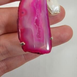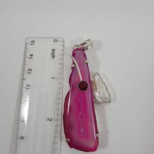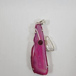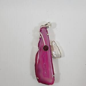 Make a bold statement with this one-of-a-kind handmade silver pendant featuring a vivid pink agate slice, elegantly set in genuine 925 sterling silver. A round faceted garnet adds rich contrast, while a natural baroque freshwater pearl lends organic luster. The unique asymmetrical design highlights expert artisan craftsmanship and modern sophistication. Includes a complimentary 20-inch sterling silver snake chain for effortless wear.