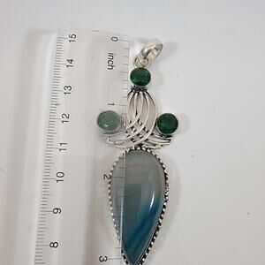 Handmade Silver Pendant with Teardrop Blue Agate and Green Quartz Gemstones Trio