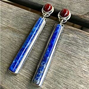 Handmade Silver Red Agate Lapis Lazuli Vintage Boho Long Vertical Earrings