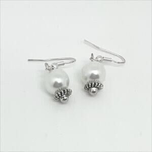Silver tone chain necklace. Faux pearls. Silver flower pendant. Total length 23”, Matching faux pearl drop dangle earrings.