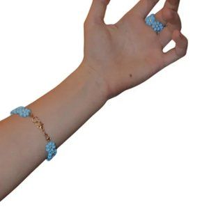 Handmade Sky Blue Seed Beaded Flowers Set of Bracelet & Ring