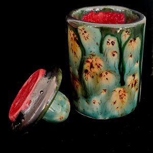 Handmade Small Ceramic Stash Jar, Keepsake Jar, Whatever you like Jar. This is a small handmade ceramic stash jar. It’s finished in a speckled turquoise and brown tone glaze with metallic rim, inside of jar is speckled raspberry.