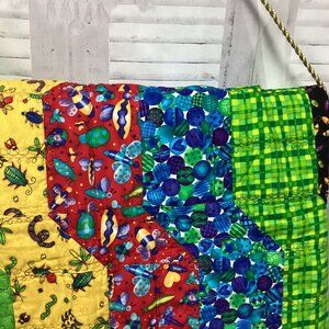 Handmade colorful rainbow quilt that's great for any kid who loves snakes or maybe loves the jungle. One side has a row of snakes in yellow, red, blue and green which are ironically Hogwarts colors. The other side is a jungle collage theme fabric. Snakes even have tongues that stick out. Beautiful piece that no doubt cost hundreds to make not to mention the time and skill. I'd be a wonderful present for a child.