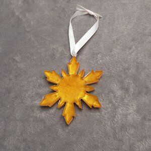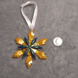 Once upon a frosty winter's night, these enchanting snowflake ornaments were born, swirling with glimmers of blue and gold. Each is a unique creation, capturing the beauty of shimmering snow and festive cheer. Their delicate ribbon hangers invite them to adorn your tree, windows, or holiday gifts. The color is a blue green with shimmering gold.