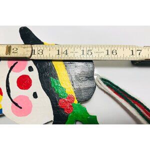 Wood, hand painted, handmade snowman Christmas decoration. Has hanger on back, yarn attached. Colorful, cheerful and unique.
