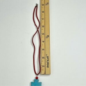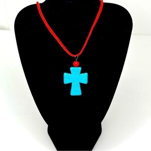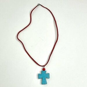 Handmade Southwestern Style Faux Turquoise Cross Necklace on Red Leather Cord
