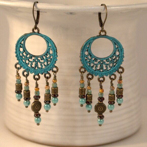 Southwestern Turquoise Chandelier Earrings Brass Dangle Pierced or Clip-on Earrings Hippy Jewelry Boho Chic Earrings Hand Patina Earrings.